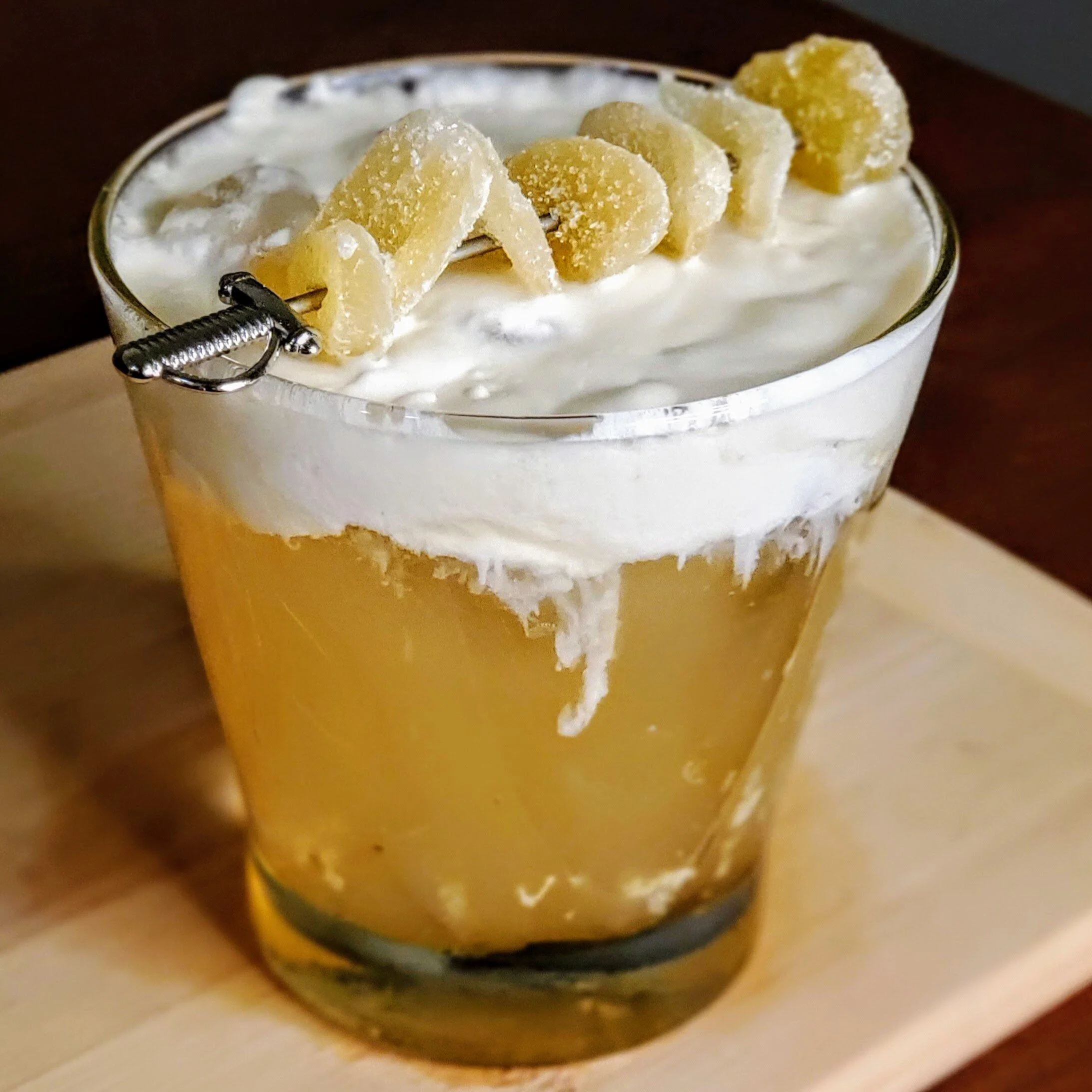 In a double rocks glass, drizzle a thin layer of honey around the inner edges. Put glass in the freezer, allowing honey to set. In one cocktail shaker, prepare the Maple-Ginger-Bourbon Cream; set aside. In a separate cocktail shaker, combine whiskey, scotch, lemon juice, honey-ginger syrup, and ginger bitters; fill shaker ¾ to the top with ice; shake vigorously for ten to fifteen seconds. Strain over fresh ice into double rocks glass from the freezer. Using a bar spoon, add a few dollops of Maple-Ginger-Whisky Cream to the top. Garnish with ginger candy.